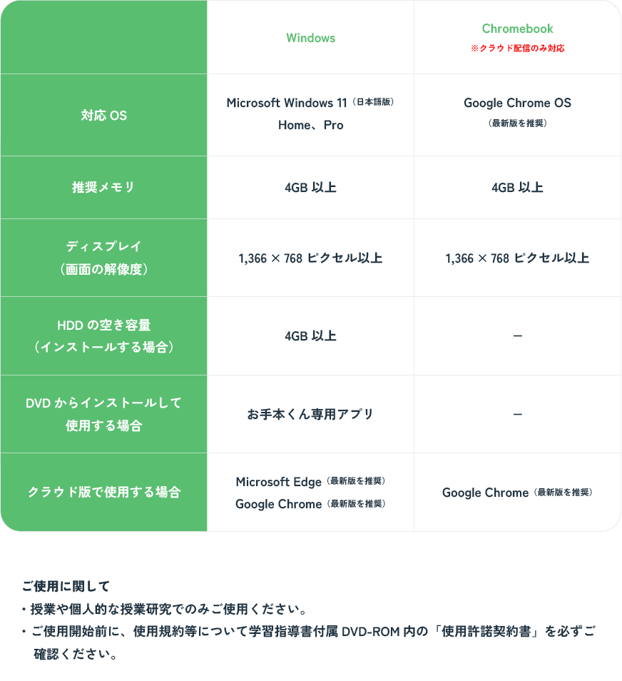 令和6年度版小学校・令和7年度版中学校学習指導書付属DVD-ROM「お手本くん」の動作環境は、次の通りです。